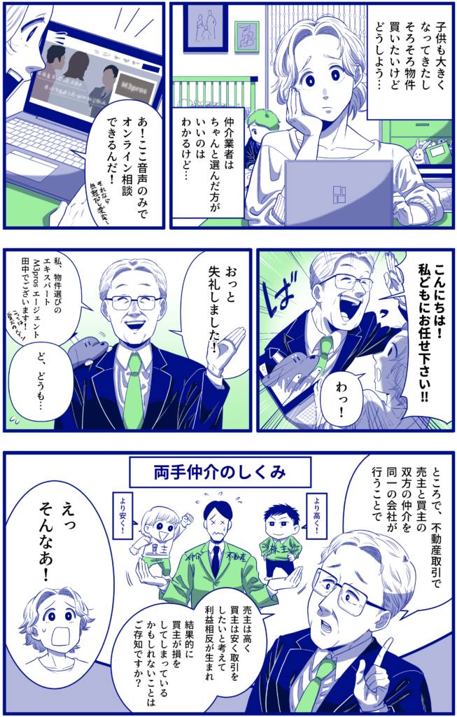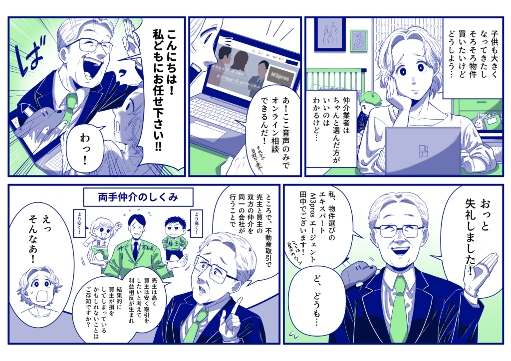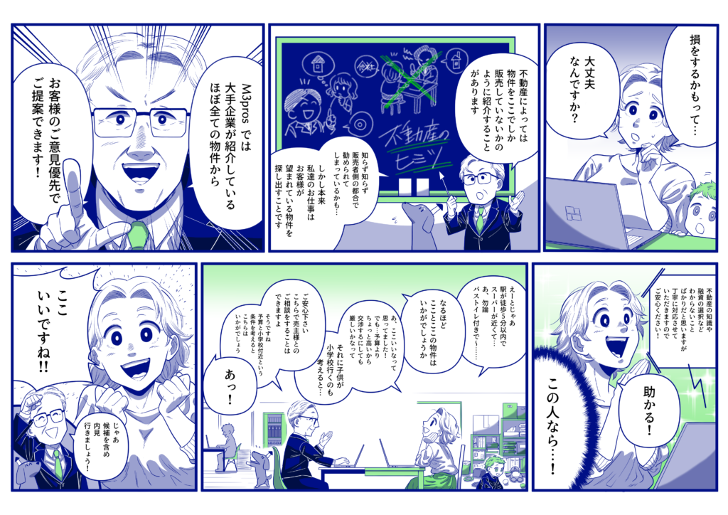 普段不動産を購入する際、”物件”を探すと見つけ出すまでに時間がかかりすぎてしまったり求めているものが見つからないことが多いかと思います。そこで私たちM3prosが提案したいのが”エージェント”を選ぶという選択肢です。M3prosには不動産に流通し知識も経験も多い素晴らしいエージェントが在籍し、皆様の不動産購入を全力でサポートします。